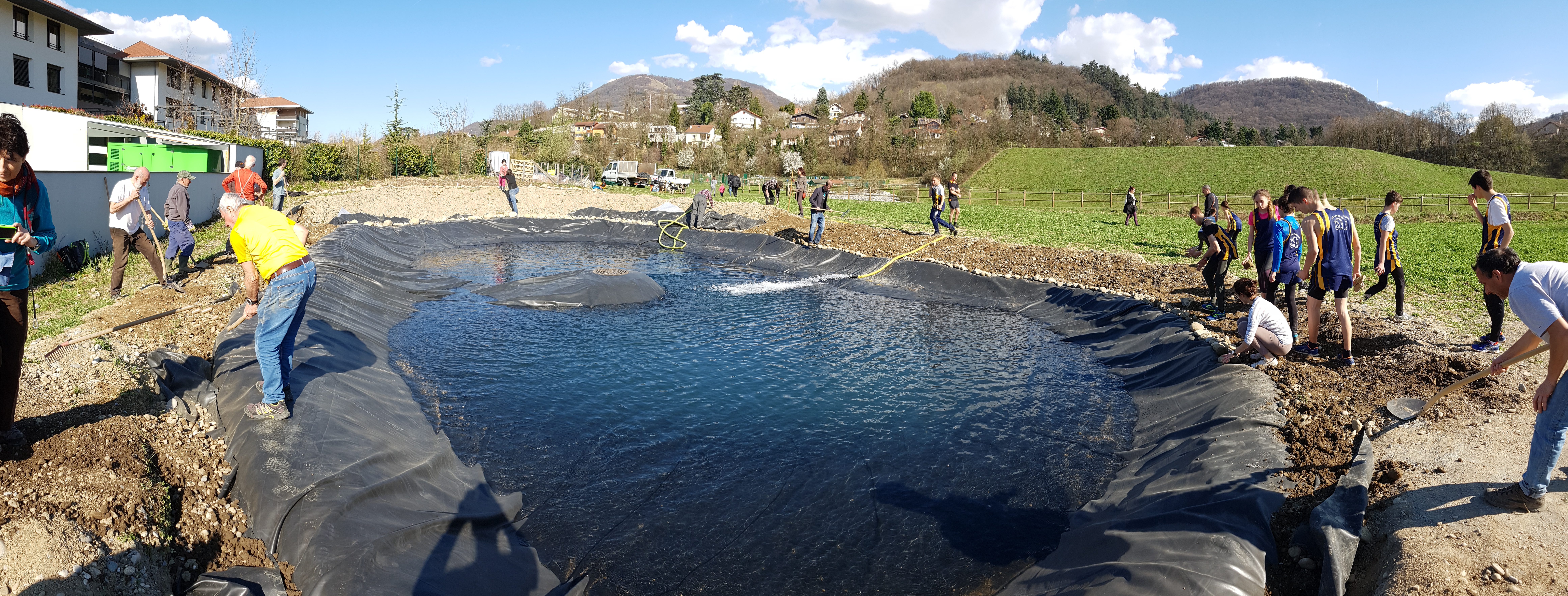 Puis, deux chantiers participatifs pour la construction de cette mare ont été organisés en février et en mars 2018 : réalisation des contours et paliers de la mare, puis finalisation des paliers, installation de la couche de sable, pose du film géotextile et de la bâche, et mise en eau de la mare.